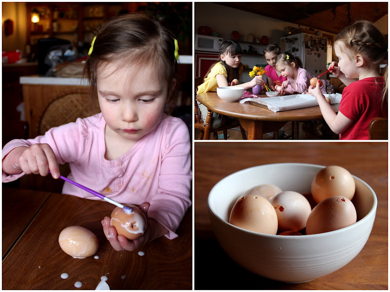 Poke holes in eggs, blow out the insides, and give said insides to husband as he prepares a breakfast feast. Mix water and glue in a bowl, and let little girls coat eggs with glue. Eat your breakfast feast and love your husband. As a finishing touch, roll the eggs in a bowl of blue glitter (or, as the bag that originally held the glitter proclaims, "FAIRY DUST.")
