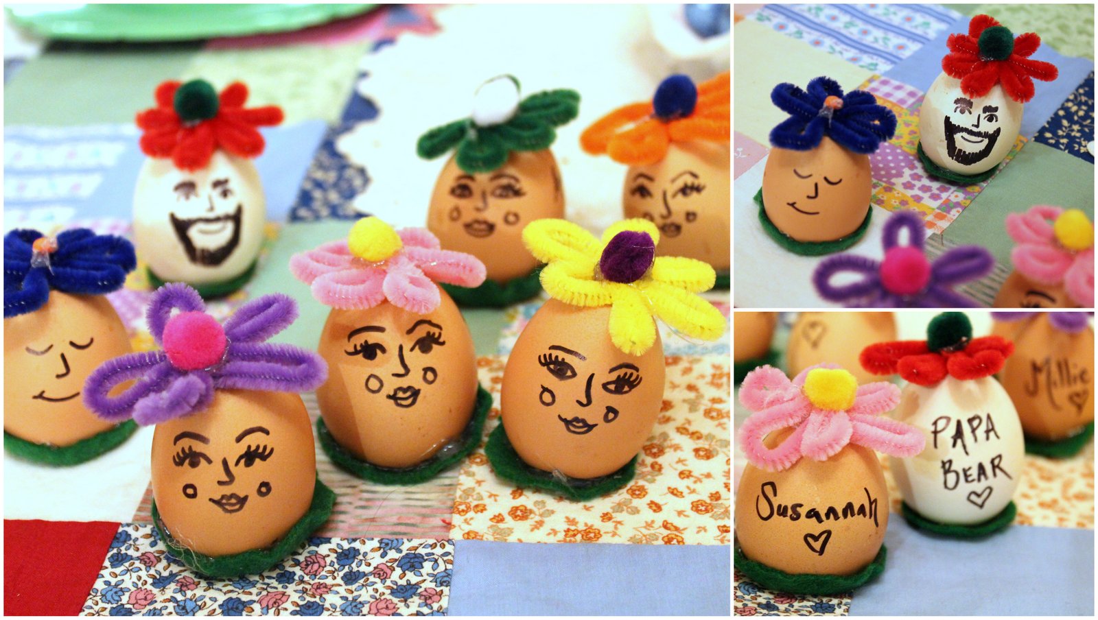 I had a wonderful Easter morning/night?/morning and got everything finished by the time the girls awoke. Chief offenders ever since I shot myself in the sleep-deprived foot by first making these, were the chocolate surprise eggs. This year, I made strange egg people wearing Easter bonnets, and I asked the milliner to make the judicious choice of manly colors for Zeke and John.