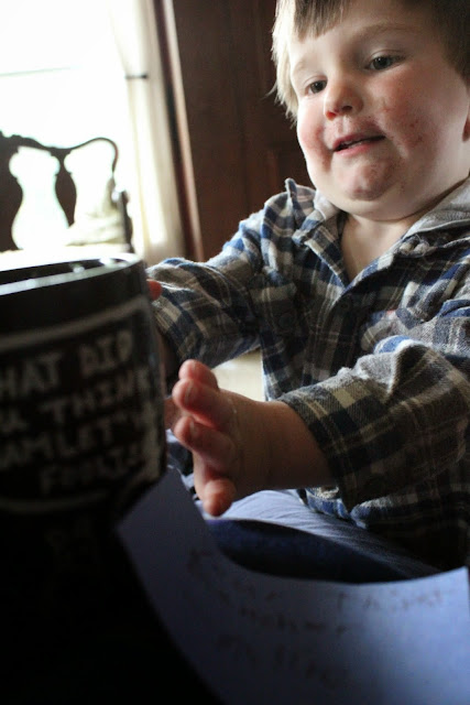 Millie has appointed herself Captain of Making Sure Mama's Drinking Yummy Stuff. She makes me hot drinks and iced tea, depending on the weather, and delivers them on a tray, usually with an accompanying note. The only glitch is the greedy vulture-boy who always swoops in as soon as she leaves the room.