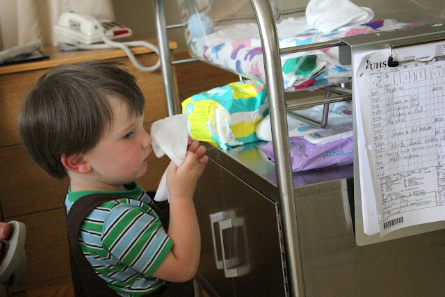 And here he is again, ignoring his newborn brother for the sake of the hospital bed. (Wouldn't you, though? Those beds are awesome.)