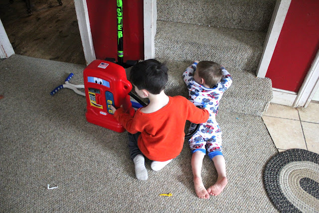 The second day of Christmas was spent playing, playing, and then, in spare moments, playing some more. I laughed so hard when I came across Zeke and Aidan using their gas pump from Grandma Owen, with Ezekiel's insistent "Tum here, Ai'an! Tum here, Ai'an! Me put das in you!"