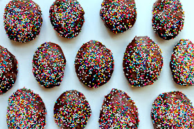 And now for the truth.  If you have your children pour most of the marshmallow batter into the flour molds, most of the eggs will look like those on the sides.  Misshapen, yes.  LARGER and more CHOCOLATEY?  Yes, indeedy.  (The moral of this tale is to always let your children pour most of the marshmallow.)