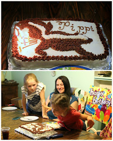 The only other pictures I have are of Piper's third celebration day. For this party, she wanted a skunk, but I didn't have enough energy to cut out an enormous skunk, like she'd originally wanted, so I made a lazy girl's version, with the candles "spraying out the back" like requested. She was easy to please.