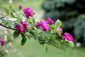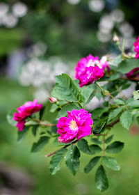 Then there are the fluorescent pink roses, so bold and bright that the camera renders them thus. I could probably tone down the saturation a bit to make their color more neutral, but that's too much work.