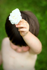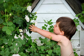 The children have made sure that I stop and smell the flowers. Zeke loves the white roses, especially, though their heady scent is lost on him as he still blows air out of his nose trying to sniff them. Poor dear. Someday he'll learn how to both talk and blow his nose (I hope). OH, and wear clothes. Someday, he'll wear clothes, too.