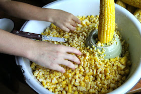 Confined to my room with a whopping spinal headache from the c-section after Piper's birth and unable to hold her yet because she was on oxygen in the nursery, I turned on the television. A friendly chef then proceeded to share a corn-cutting method that changed my life. In the past, when preparing corn to freeze for winter, I cut it on a cutting board. The kernels would fly east, west, north, and south. No longer.