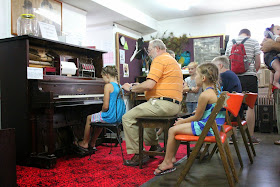 One of the girls' favorite experiences at the fair is pumping the pedals of the 1913 player piano. I like it, too, especially because the old gentleman who oversees it always sings along.