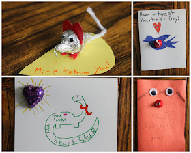 Every year it's the same. The element that now makes creating nearly 100 valentines bearable is that I don't have to help with most of them anymore. (!)  I scout out ideas on ye olde internet, show them to the bigger girls, and they pick out what ones they want to make, mostly on their own.  If they don't see anything they like, they make up their own.