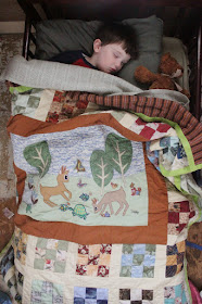 After taking a picture of sleeping Zeke, I realized it was my best documentation of the baby quilt Mopsy made him nearly three years ago,