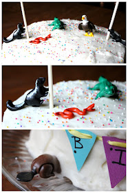 I decorated her cake after supper while she opened presents from my mother, thanking my stars for her choice of cream cheese frosting the whole time. (SUCH a good cake. Recipe here. We used overripe bananas and increased the frosting to have some for between the layers.)