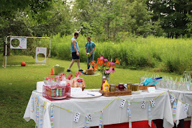 To avoid that nervous breakdown Annika was worried about, we kept the food simple: hot dogs, watermelon, potato salad, popcorn, and chips and layered bean dip (the last of which several sets of guests made and brought for us!). Drinks were iced tea, ice water, and lemonade, and dessert was a blueberry trifle, a delicious fruit cobbler my sister brought, and gross rainbow cupcakes. Next time, I'll frost them with ALL BUTTER frosting, heat and melting be darned.